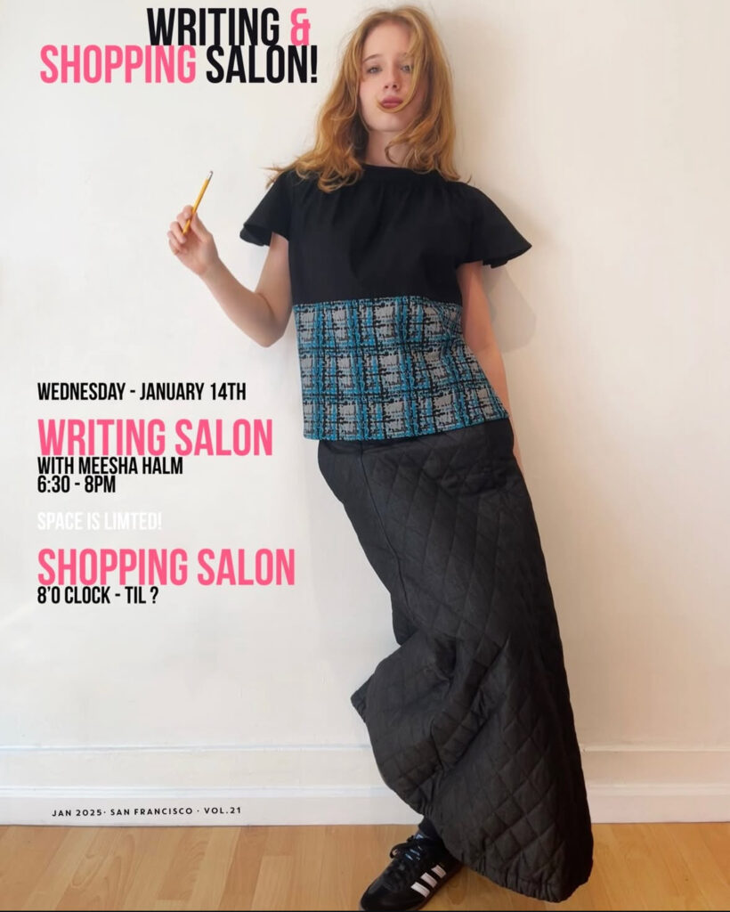 Our Writing & Shopping Salon returns Wednesday, January 14th—pen to paper, then straight to the racks. Writing Salon with Meesha Halm, followed by shopping after hours. Space is limited. Taste is not.